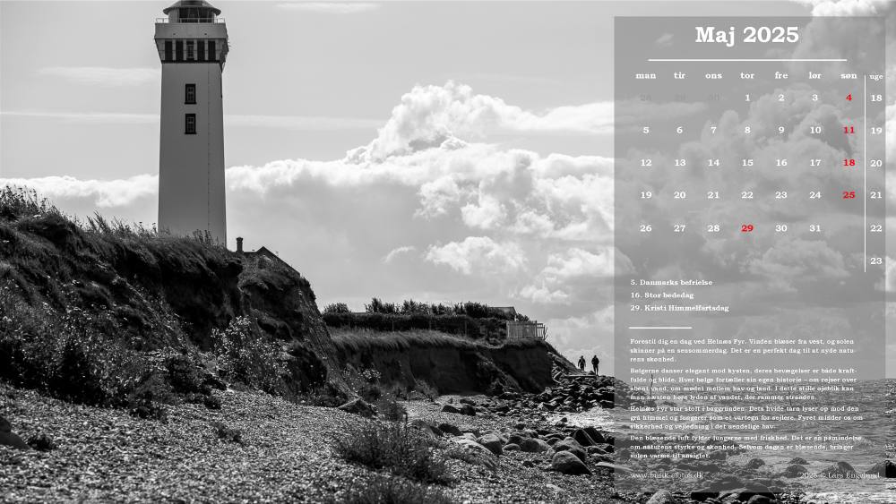 Her er et lækkert, monokromt landskabsbillede, som du kan downloade. Det viser strandkanten ved Helnæs Fyr i det smukke sydfynske øhav, og datoerne er fra maj 2025.
